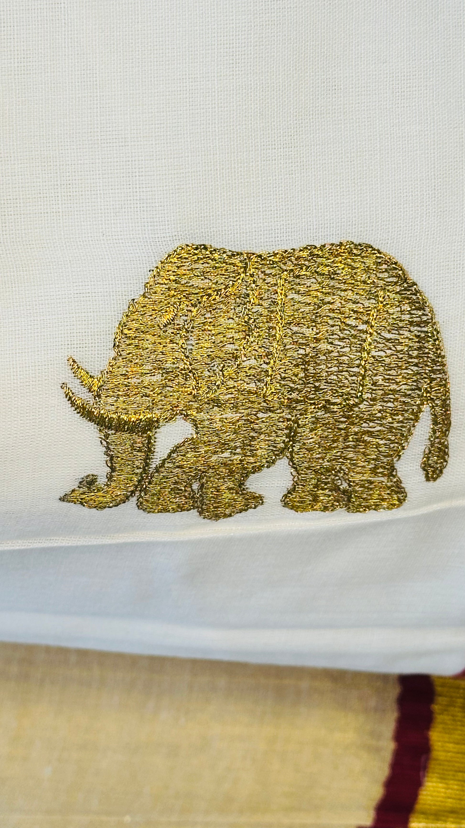 Classic and timeless saree is elevated with a red and gold embroidered elephant motifs all over the saree that adds a touch of festive elegance.Woven in cotton fabric and finished with a traditional gold and red border, it embodies elegance and tradition in every drape. Lightweight yet luxurious, this saree is perfect for weddings, festive occasions, and special celebrations where you want to shine with grace.