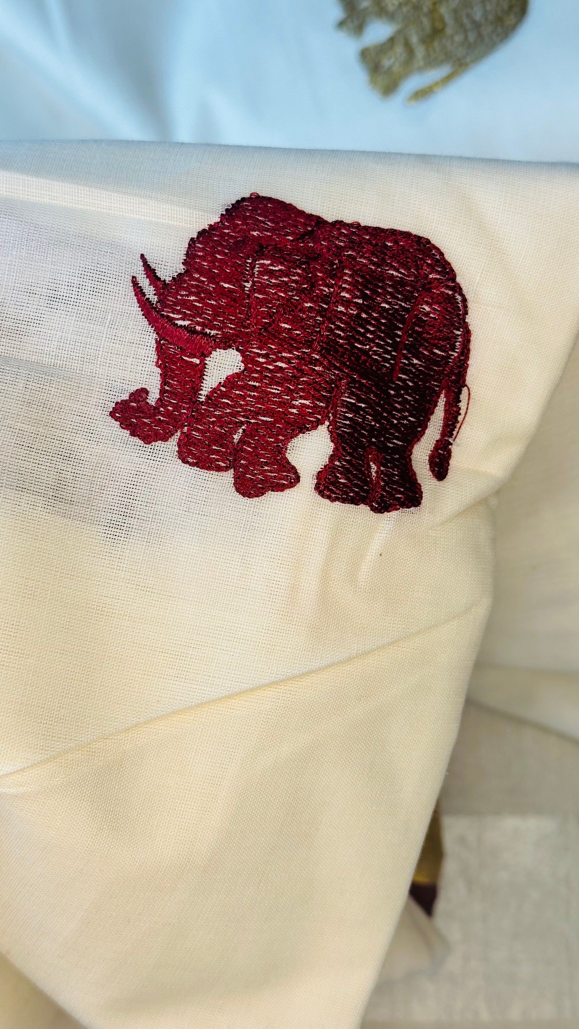 Body: Off White Cotton with red and gold embroidered elephant motifs