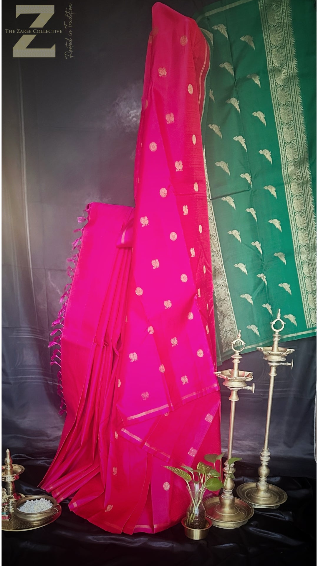 A true embodiment of divine beauty, Lakshmi from our Sankari Collection is a celebration of tradition and artistry. Woven in a rich pink hue, this saree is adorned with the enchanting Myil (peacock) Chakram (circle) motif, symbolizing grace, wisdom, and eternity. The contrast green pallu is a masterpiece in itself, featuring exquisite depictions of elephants and birds, representing strength, prosperity, and harmony. Every thread of this saree whispers tales of heritage, making it a perfect choice for auspicious occasions, festive gatherings, and timeless moments. Drape yourself in Lakshmi, where elegance meets tradition, and let its artistry weave magic into your presence.